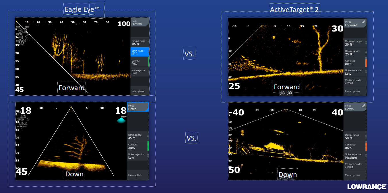 Rozdiel v snímaní Active Target2 a EagleEye je v tom, že Active Target2 sníma až 135° x 18°, tzn. že pokrýva napr. pohľad dopredu – Forward od hladiny pred loďou, pod loď až za loď.