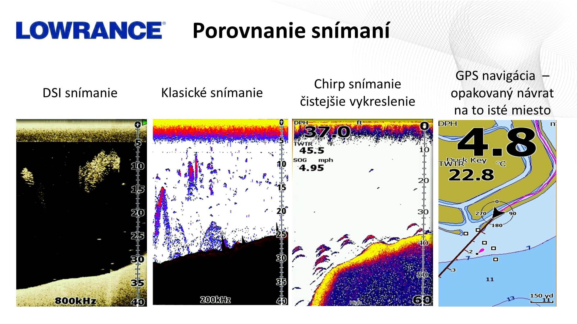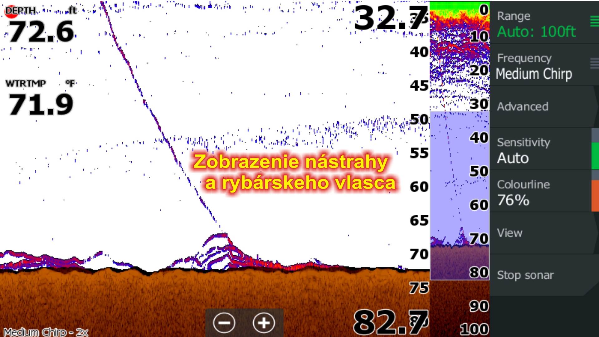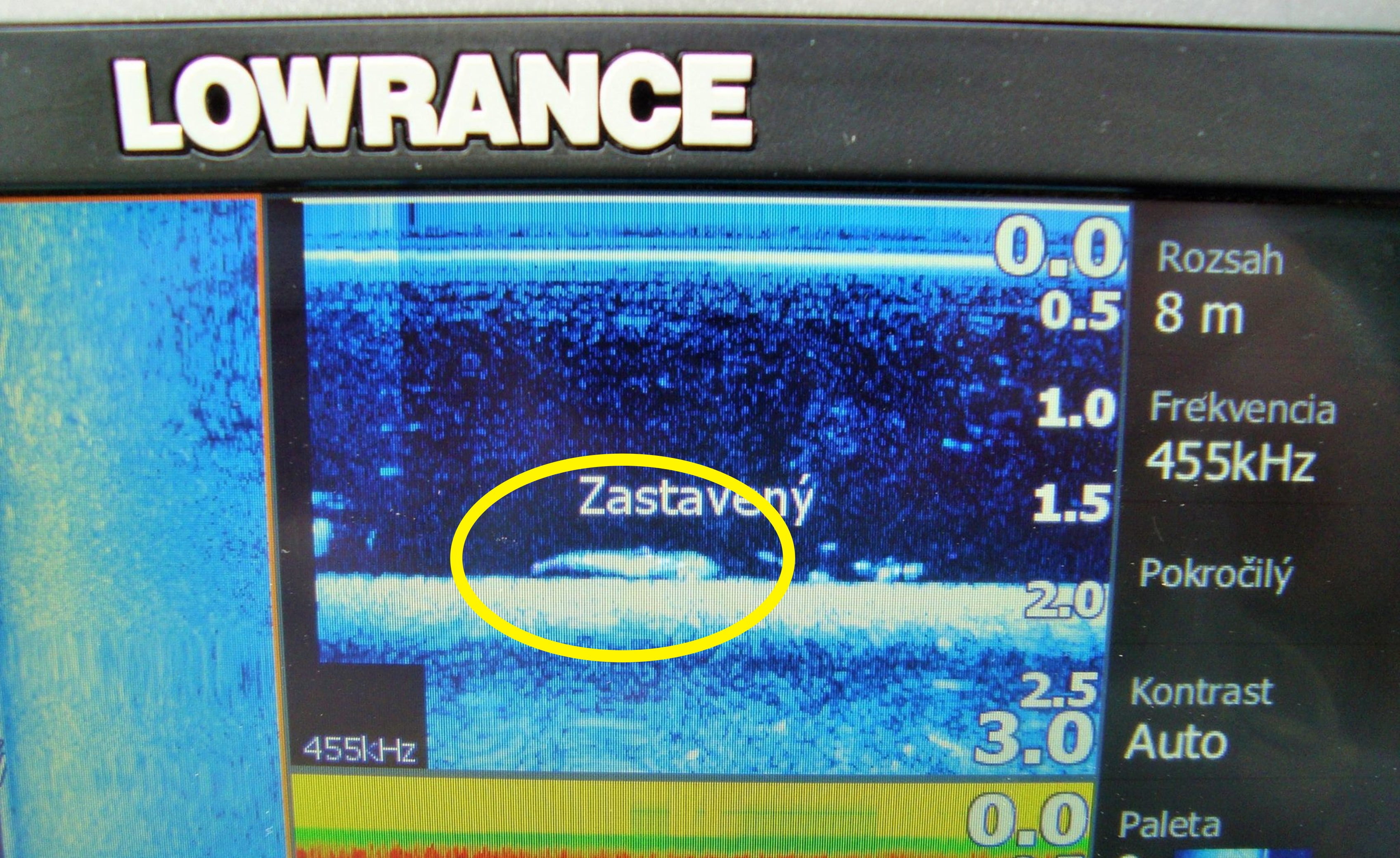 Predvolené vykreslenie vodného stĺpca v Lowrance je biele pozadie a sila echa je vykreslená v prípade slabých odrazov od čiernej, cez modrú, pri silnejšom echu cez červenú, žltú až po jasne zelenú – to je silné echo. Ak je ryba vykreslená v strede oblúka ako veľká – hrubá a farebne žltá až zelená tak je to veľká ryba. Pri výbere inej farebnej palety je samozrejme silné a slabé echo v iných farbách daných zvolenou paletou. Klikni Tu: Rybárske sonary