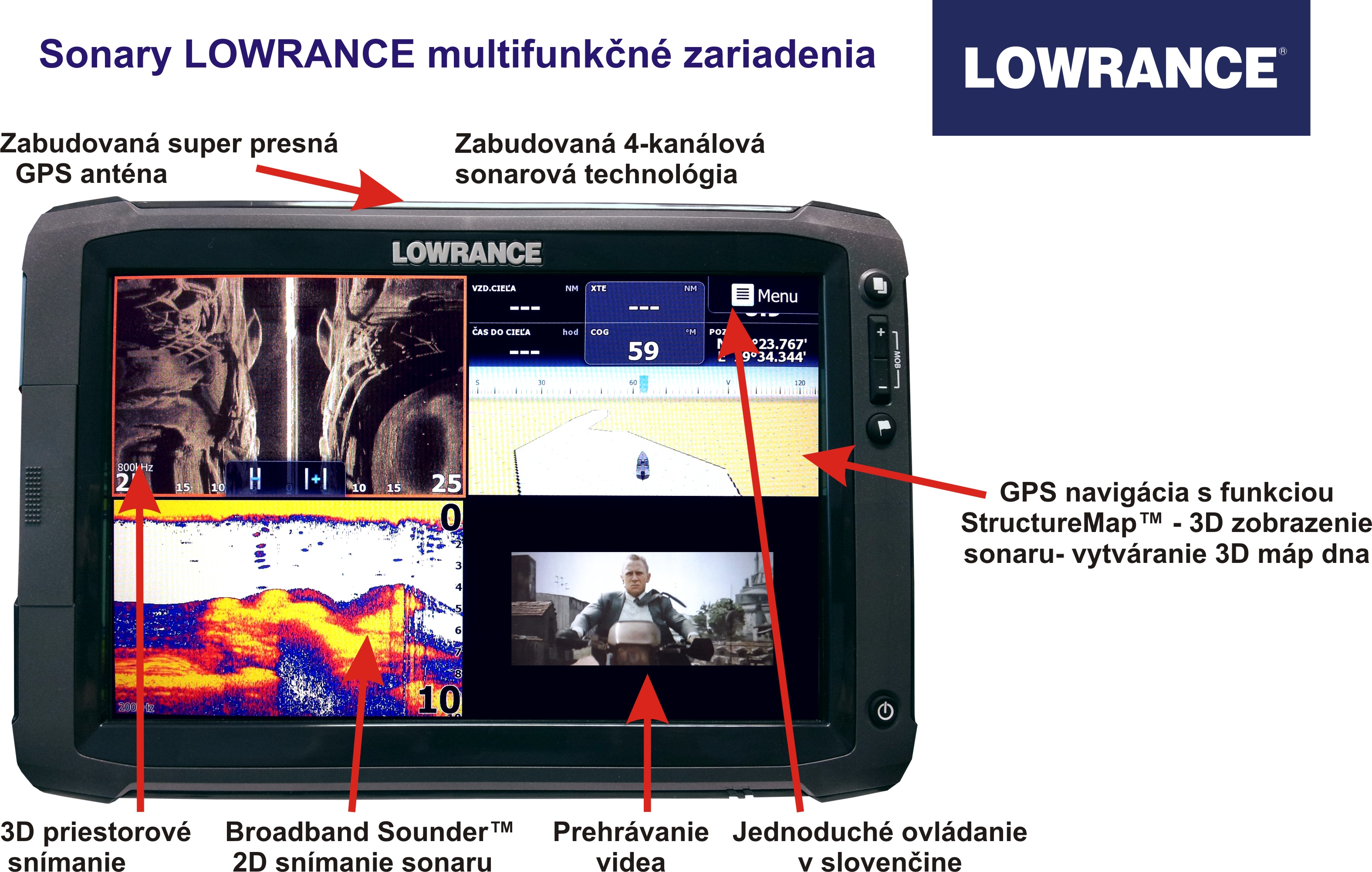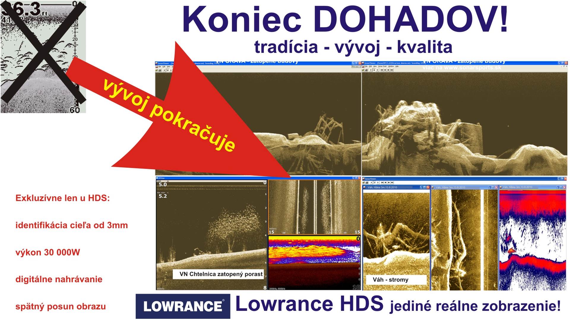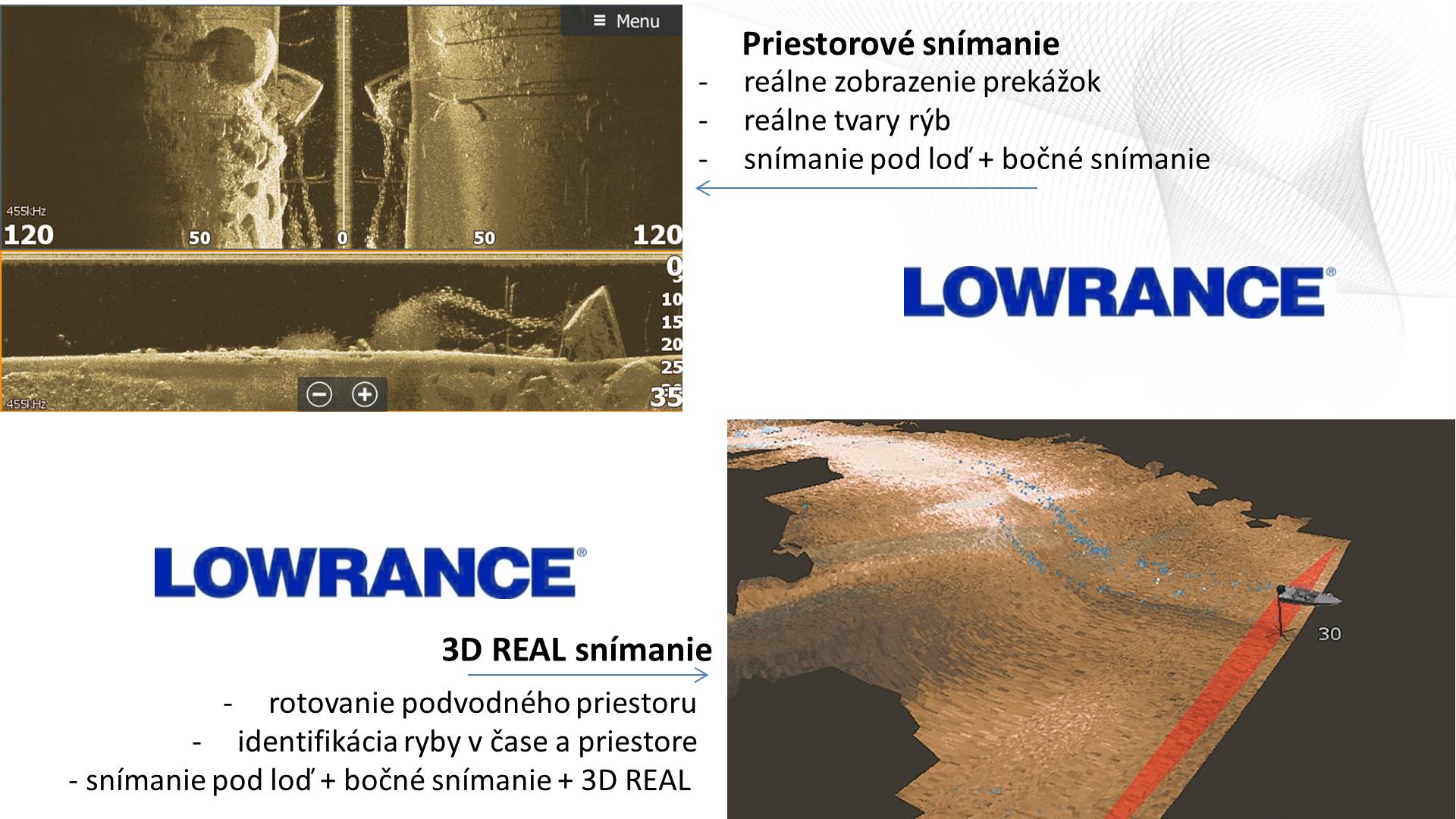Predvolené vykreslenie vodného stĺpca v Lowrance je biele pozadie a sila echa je vykreslená v prípade slabých odrazov od čiernej, cez modrú, pri silnejšom echu cez červenú, žltú až po jasne zelenú – to je silné echo. Ak je ryba vykreslená v strede oblúka ako veľká – hrubá a farebne žltá až zelená tak je to veľká ryba. Pri výbere inej farebnej palety je samozrejme silné a slabé echo v iných farbách daných zvolenou paletou. Klikni Tu: Rybárske sonary