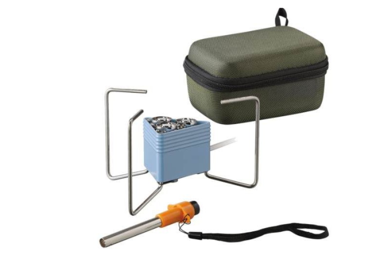 Rybársky skladací varič TRIANGLE, ktorého obsahom je aj piezo zapaľovač a prepravné púzdro